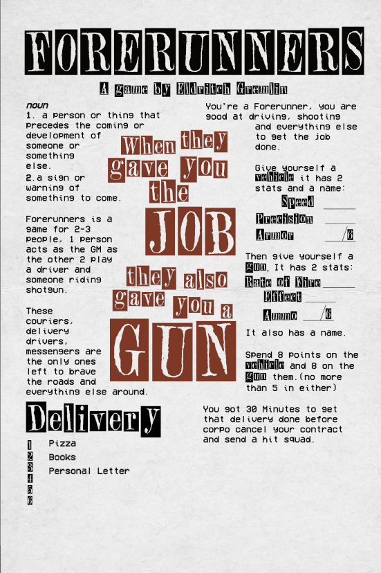 Last Week I went through the design Process of With Haste And Anger one of my two entries for this years One-Page Jam 2024, this week I’ll go through FORERUNNERS and how the the opening chapters of Snow Crash by Neal Stephenson inspired the game.